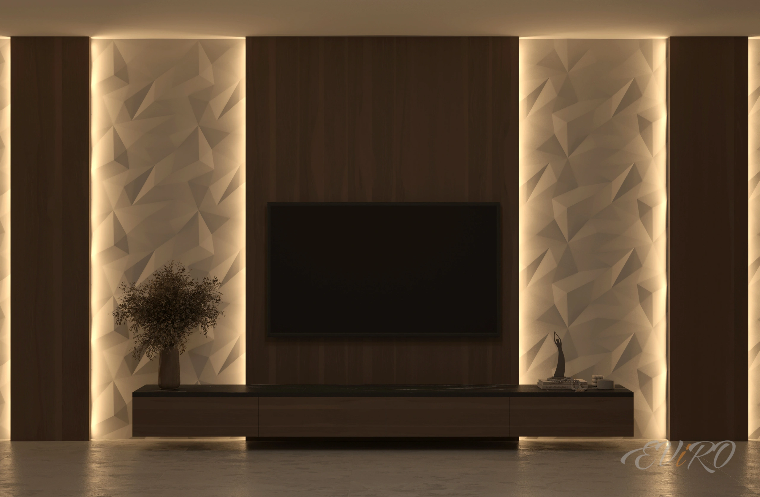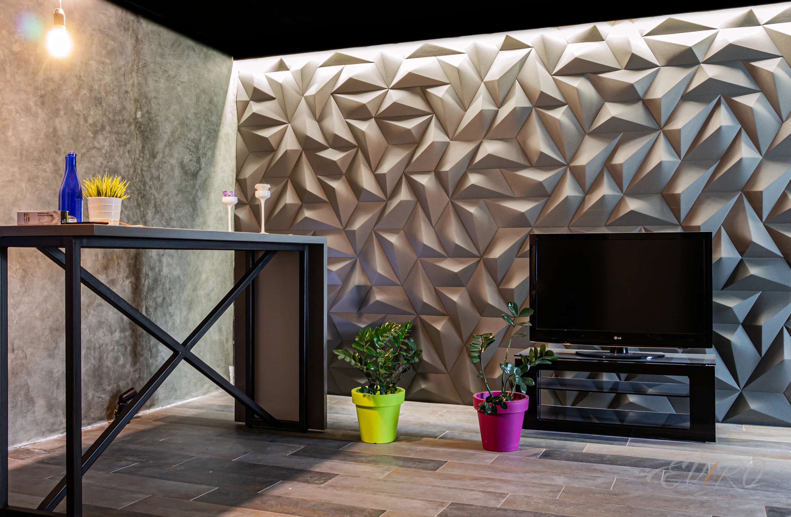 Использование гипсовых угловых профилей EViRO для подсветки декоративных рельефных панелей из гипса позволяет создать современный и необычный интерьер. Игра света и тени на стеновых 3d панелях создает неповторимую атмосферу уюта и комфорта.