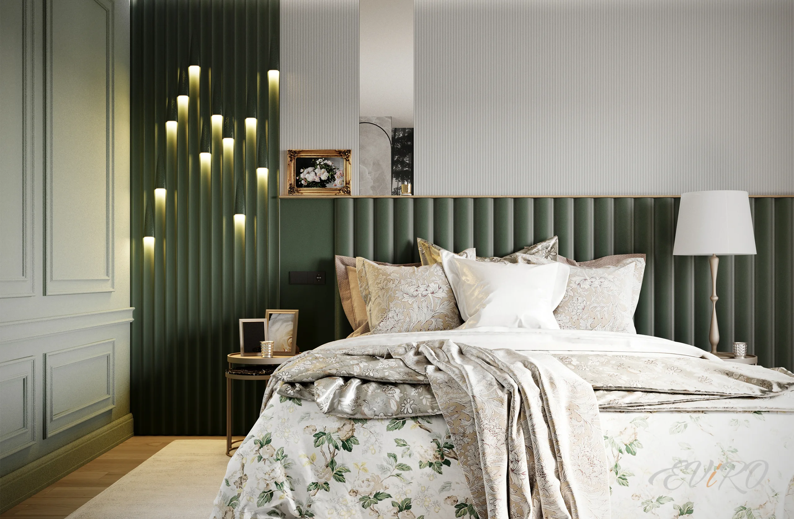 Превращение спальни в оазис уюта и спокойствия стало возможным благодаря продуманному использованию декоративных рейковых панелей. Этот современный дизайнерский подход далеко вышел за рамки простого украшения стен. Он представляет собой многогранный инструмент, позволяющий не только добавить изюминку в интерьер, но и эффективно зонировать пространство, придавая ему глубину и текстурную выразительность, без ощущения перегруженности деталями. В данном конкретном случае, мастерство дизайнера проявилось в создании целой композиции из различных реечных панелей, каждая из которых играет свою уникальную роль в общем ансамбле. Центральное место в этой утонченной инсталляции занимает объемная 3D гипсовая панель EViRO Round Band, расположенная за изголовьем кровати. Ее плавные, изящные линии и выразительная, трехмерная форма моментально приковывают взгляд, внося динамику и ощущение движения в статичный интерьер спальни. Она становится настоящим арт-объектом, притягивающим внимание и задающим тон всему дизайну. Однако, завораживающая красота панели EViRO Round Band не единственное украшение этой спальни. Рядом с ней гармонично вписаны 3D панели EViRO Спарта. Их особенность заключается не только в интересной фактуре и геометрическом рисунке, но и во встроенной системе мягкой, рассеянной подсветки. Это инновационное решение позволяет создать в спальне атмосферу умиротворенности и спокойствия, подготавливая к приятному отдыху и крепкому сну. Нежное, приглушенное свечение вертикальных реечных панелей мягко рассеивается, не раздражая глаза и создавая таинственный, загадочный полумрак. Композицию завершает реечная панель EViRO Rollers, которая вносит элегантные нотки минимализма и строгой геометрии. Ее четкие линии и ритмичный рисунок создают ощущение порядка и гармонии, идеально сбалансировав динамику центральной панели и мягкое свечение настенных панелей EVIRO Спарта. Гипсовые рейки искусно комбинируют плавные линии и четкие геометрические формы, объемные элементы и плоские поверхности, создавая уникальную и привлекательную атмосферу в спальне. Результат превосходит все ожидания: спальня с 3d панелями превращается в настоящее убежище от суеты, место для отдыха, релаксации и творческого вдохновения, где каждая деталь продумана до мелочей. Это не просто настенный декор, это целостное художественное решение, олицетворяющее современный и изящный стиль.